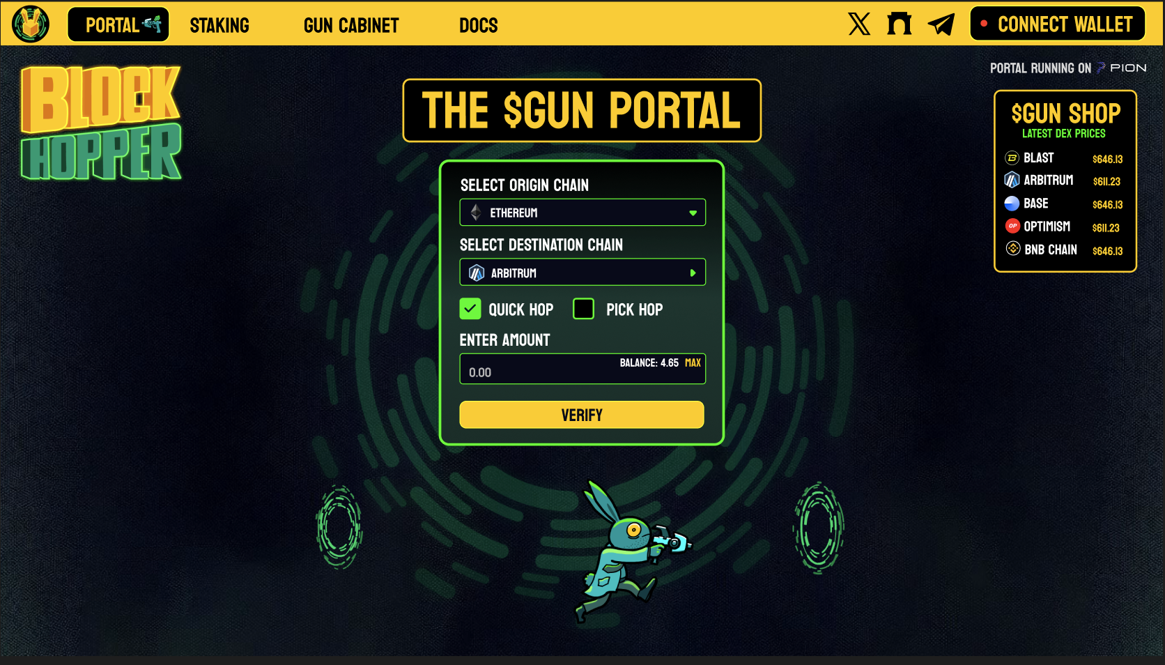 Since $GUN is an ERC404, $GUN tokens can be bought on Uniswap or Opensea on each chain, or earned by staking $GUN within the BlockHopper app. Uniswap prices are aggregated and displayed within the BlockHopper app so the user can easily decide which chain to go to for the best opportunities.